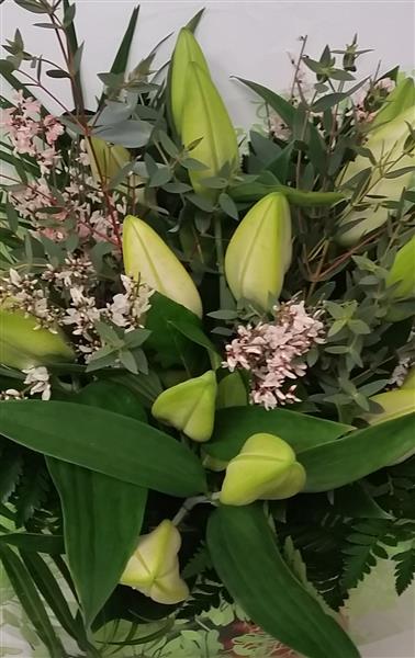 A simple, hand-tied bouquet of highly scented white oriental lilies and foliage.