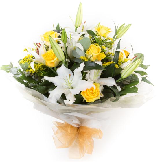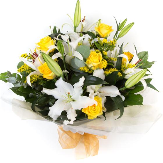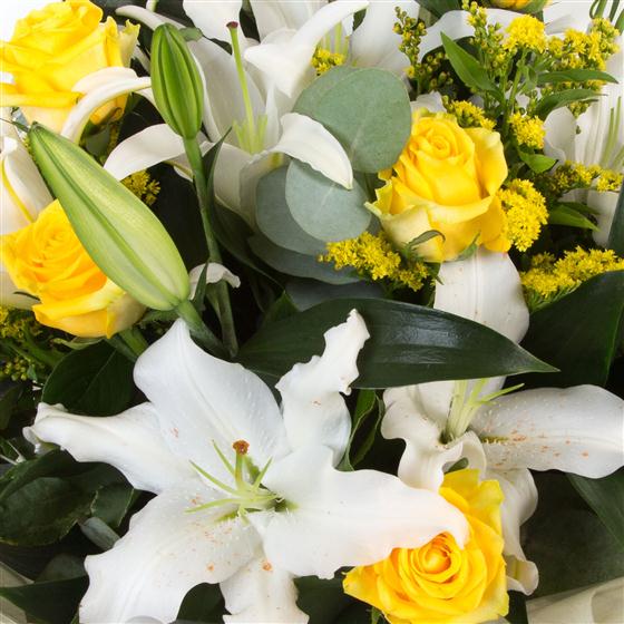 A fragrant delight of white oriental lilies and golden yellow roses mixed with solidaster and eucalyptus.
