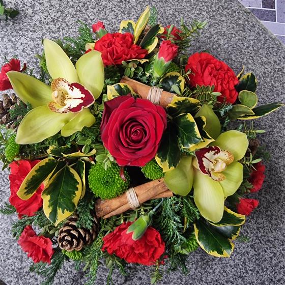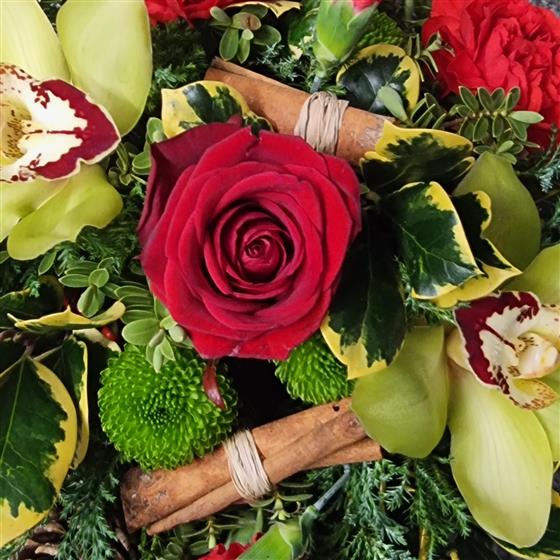 Seasonal Tribute suitable for a Grave in rich reds and lasting Christmas foliages.