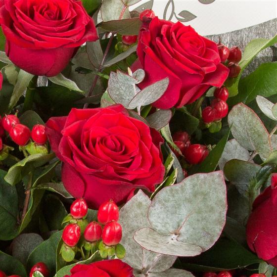 A hand-tied bouquet of six sumptuous roses encased in a selection of greenery.