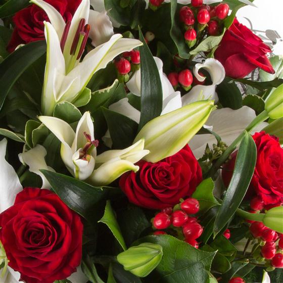 An beautiful display of highly fragranced white lilies and fabulous red roses with a variety of foliage and berries.